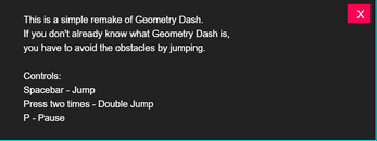 This is a simple remake of geometry dash. You use the up arrow to jump. There are all the buttons in the settings. You can buy different skins in the shop with coins. You get coins by playing and getting a good score.